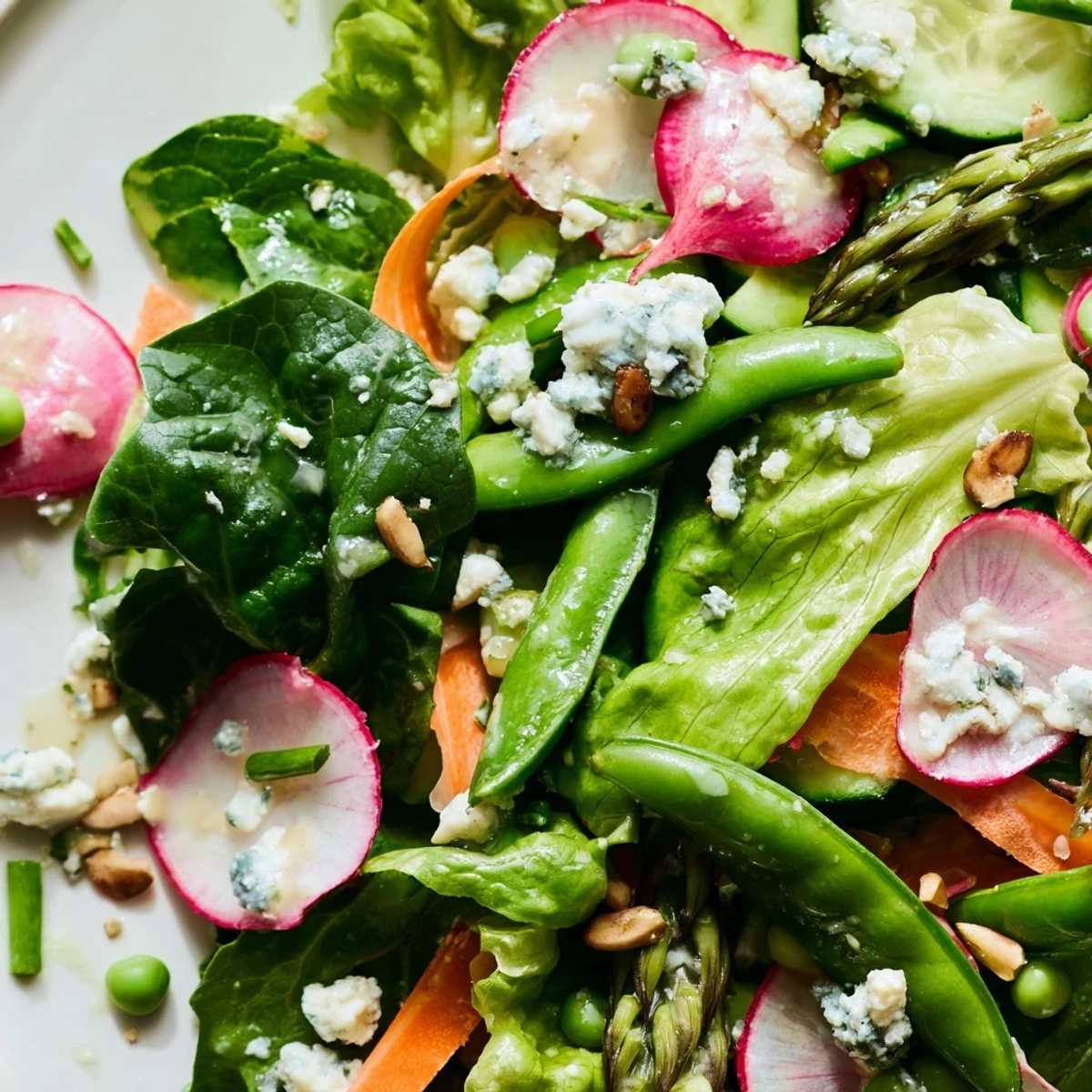 - In your largest salad bowl, gently toss together spinach, mixed greens, sliced radishes, cucumber ribbons, cooled asparagus, peas, and those delicate carrot ribbons
