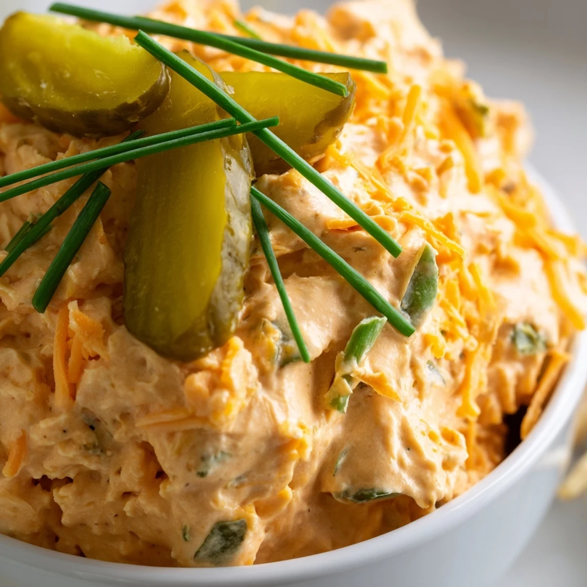 This zesty dip combines smooth cream cheese, sour cream, and mayonnaise with bold buffalo wing sauce and plenty of chopped dill pickles. Shredded cheddar adds richness while fresh chives bring brightness. The tangy, creamy texture pairs beautifully with tortilla chips, pretzels, or fresh vegetable sticks.