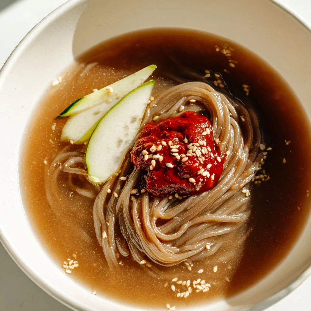 Pork broth adds a different richness, while chicken broth keeps it lighter. I have tried dongchimi brine mixed into the broth—a traditional addition that turns the soup slightly cloudy but adds this incredible fermented depth. The beauty of naengmyeon is how forgiving the base is, letting you adjust sweetness and tang until it hits exactly right.